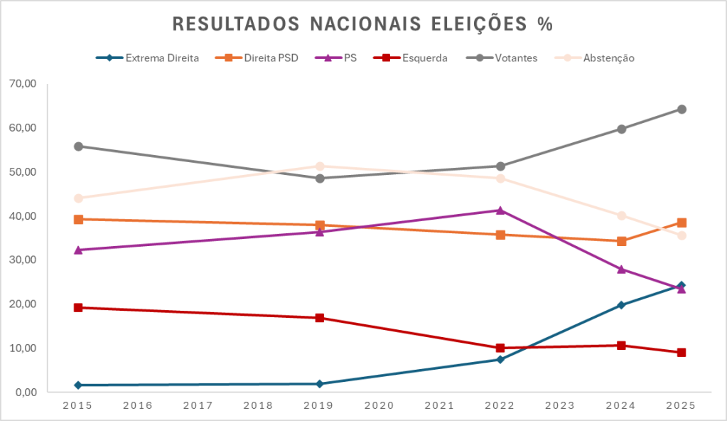 Figura 2 – Ministério da Administração Interna – Eleições Legislativas 2015, 2019, 2022, 2024 e 2025, disponíveis em: https://www.eleicoes.mai.gov.pt/. Extrema Direita agrega votação dos partidos CHEGA, ADN e Ergue-te; Direta PSD, os partidos PSD, CDS-PP, Iniciativa Liberal, Nova Direita, VOLT, MPT , Nova Direita e PLS; Esquerda, os partidos PCP-PEV, BE e Livre.