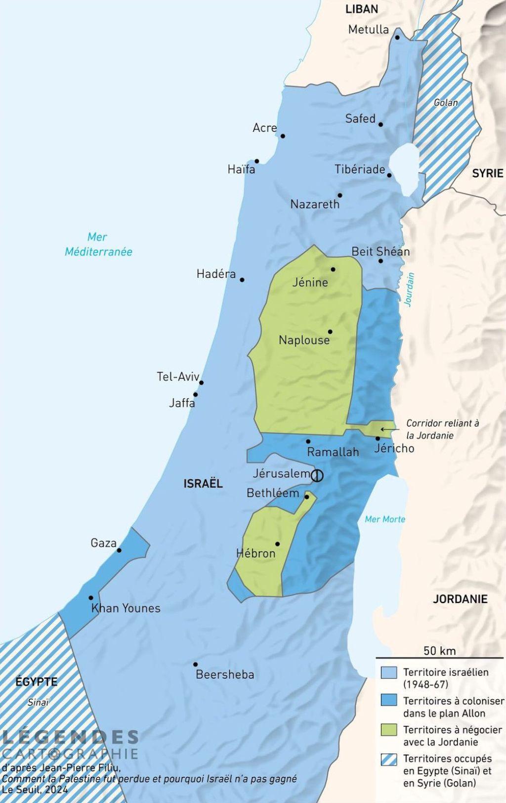De acordo com o Instituto Akevot de pesquisas sobre o conflito israelo-palestino, em 18 de outubro de 1967, Yigal Allon, então ministro do Trabalho, apresentou ao Comitê Ministerial de Assuntos de Segurança, oito meses antes de se tornar vice-primeiro-ministro de Israel, uma proposta (14) para eliminar a linha verde dos mapas oficiais israelenses, anular os acordos de armistício de 1949 e redefinir as fronteiras. O novo mapa incluía a Cisjordânia, a Faixa de Gaza, o planalto do Golã sírio e a península do Sinai.