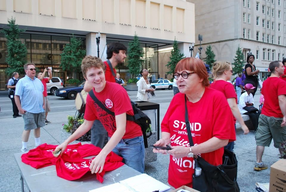 Joanna (à direita) trabalhando em uma mesa durante a greve dos professores de Chicago.